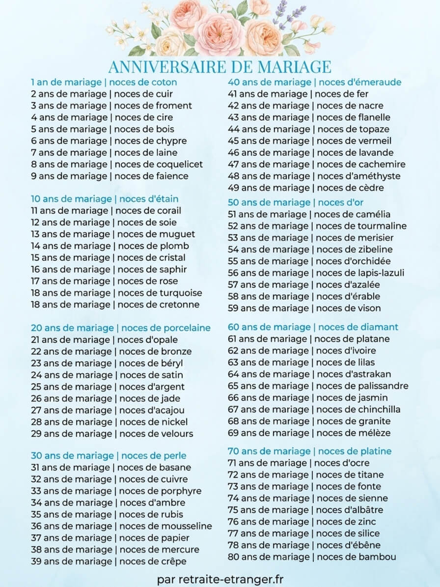 Les noces de mariage suivent une liste établie qui associe chaque année d’union à une matière symbolique. La première année est celle des noces de coton, la cinquième des noces de bois, la vingt-cinquième des noces d’argent, la cinquantième des noces d’or. Au-delà de 80 ans, les dénominations varient selon les sources folkloriques et les usages régionaux.